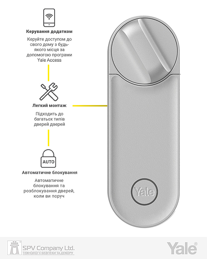 - Двофакторна безпека: Обліковий запис Yale Home захищений 2-факторною аутентифікацією, яка потребує паролю та перевірки системою ідентичності користувача та базується на адресі електронної пошти або номеру телефону