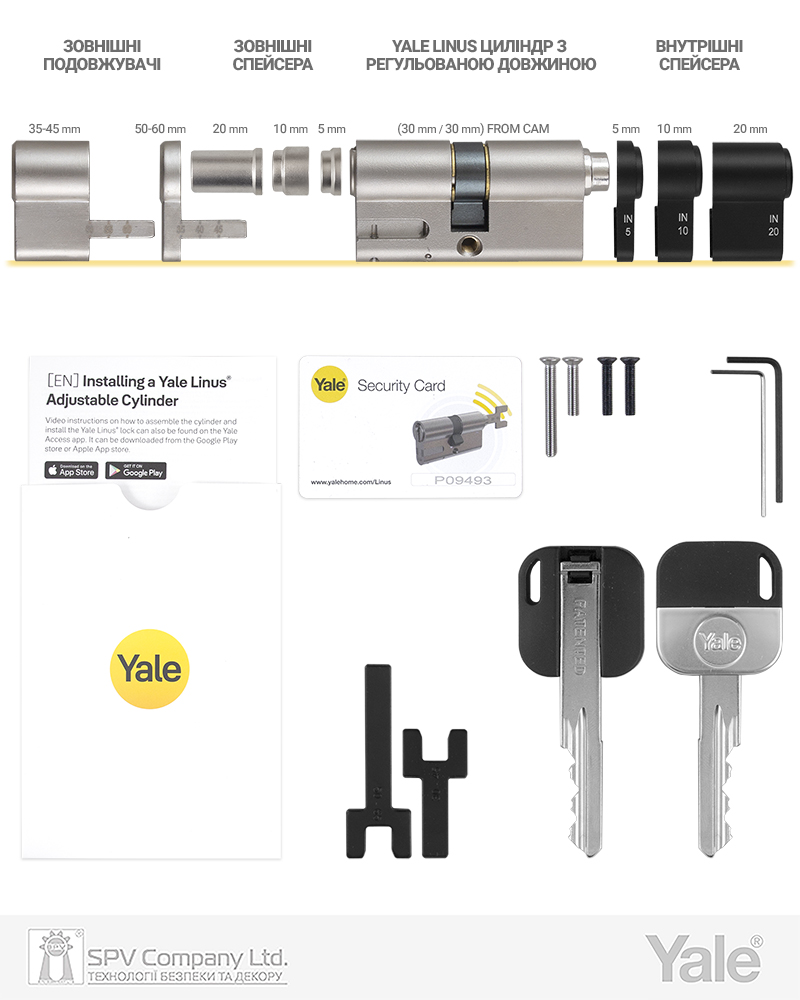 Циліндр має унікальну систему подовжень та постачається в комплекті з всіма елементами, необхідними для швидкої зміни розміру та симетрії (можливо виконати безпосередньо на місці під час монтажу контролеру YALE LINUS)
