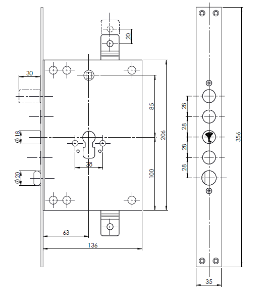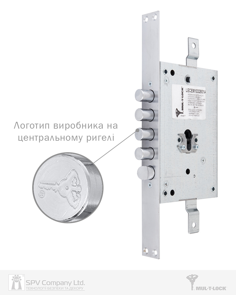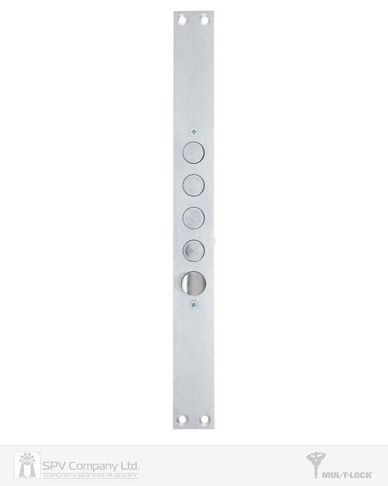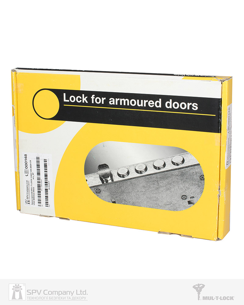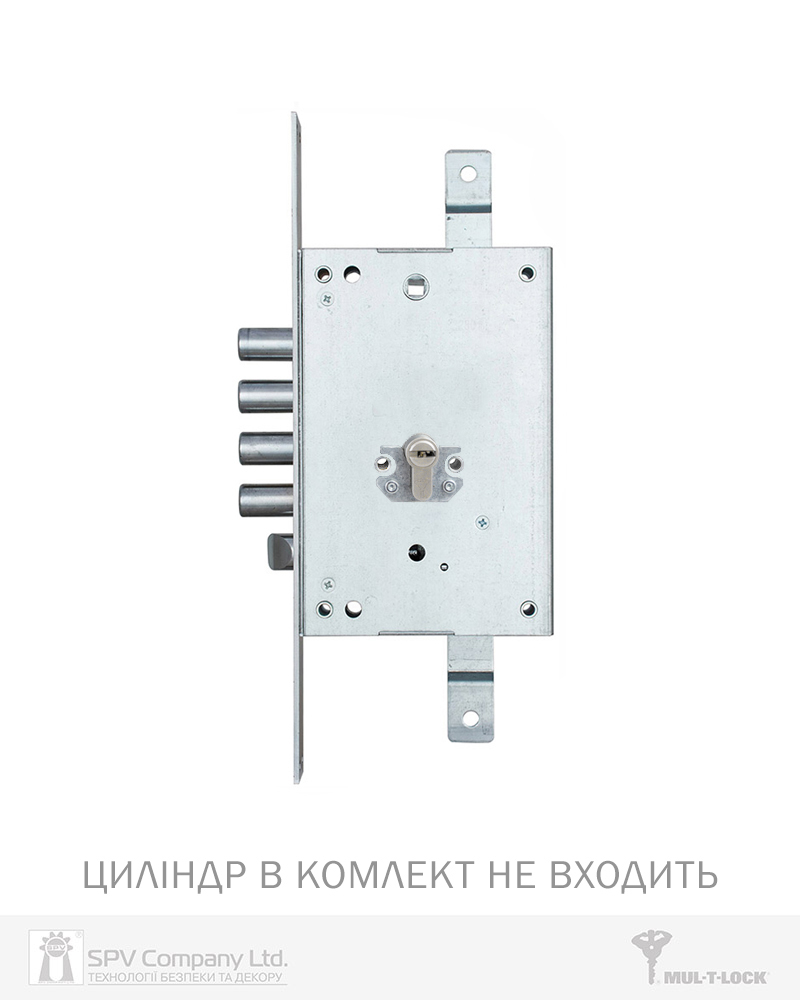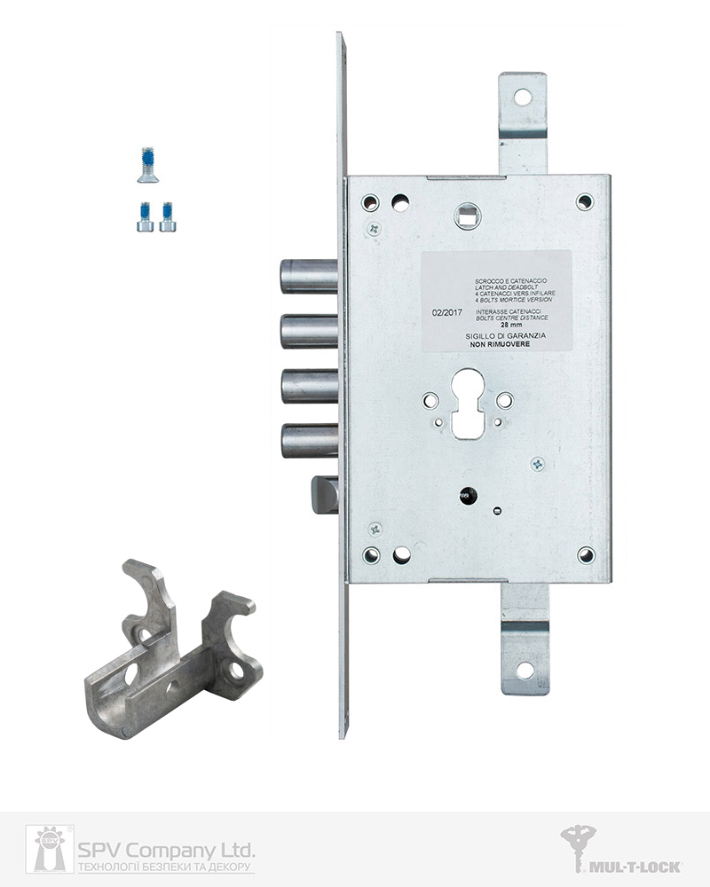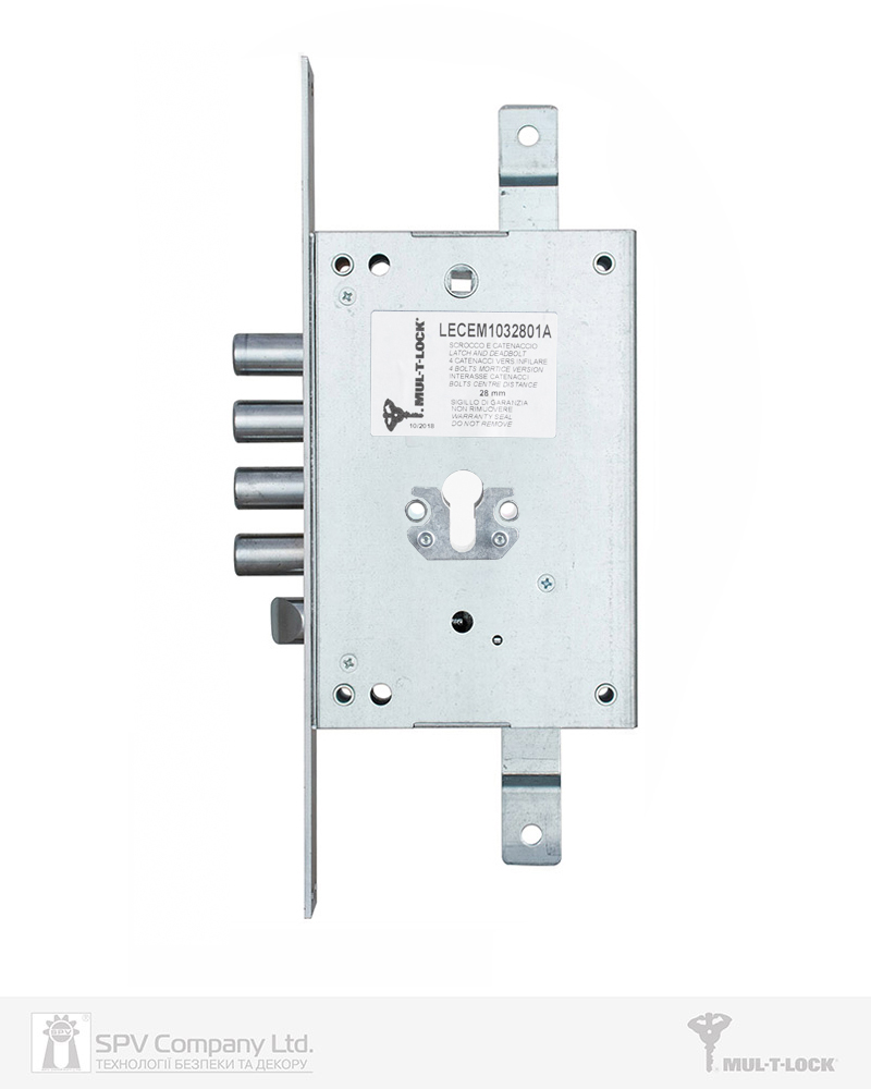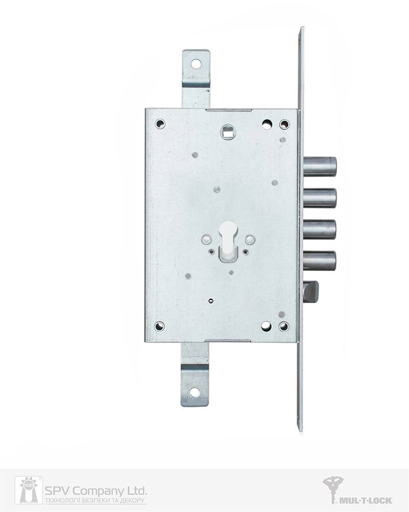 Основний замок 3-направленого замикання MUL-T-LOCK А528. Універсальне застосування завдяки невеликим розмірам. Міжцентрова відстань 85 мм. BackSet - 63 мм. 4 ригелі Ø 18.00 мм. Вихід ригелів 30 мм. Відстань між ригелями 28 мм. Осьовий опір ригеля> 6 кН. Реверсивна заскочка із нержавіючої сталі. Зворотна планка не постачається. При замкнутому циліндрі ручка заблокована.