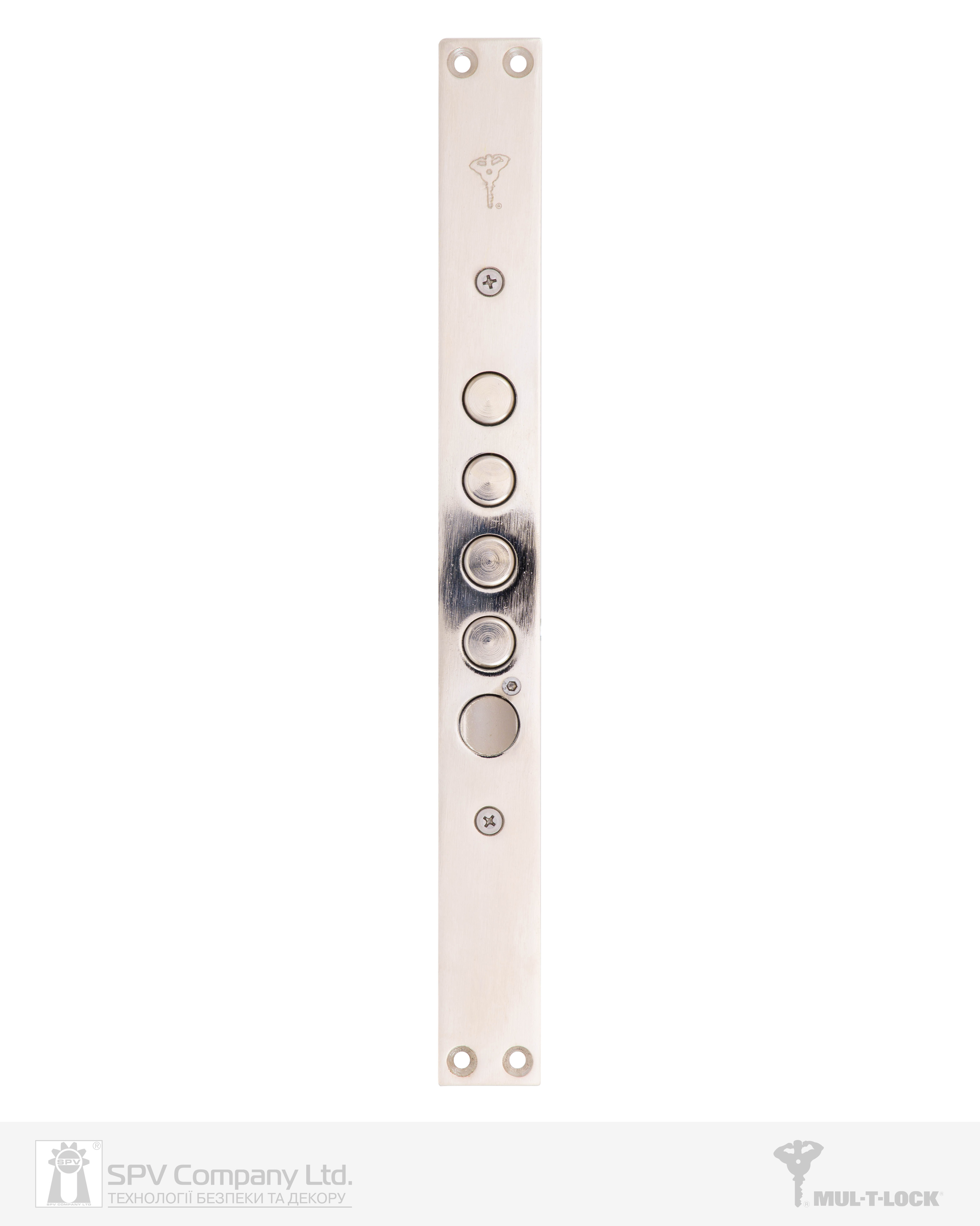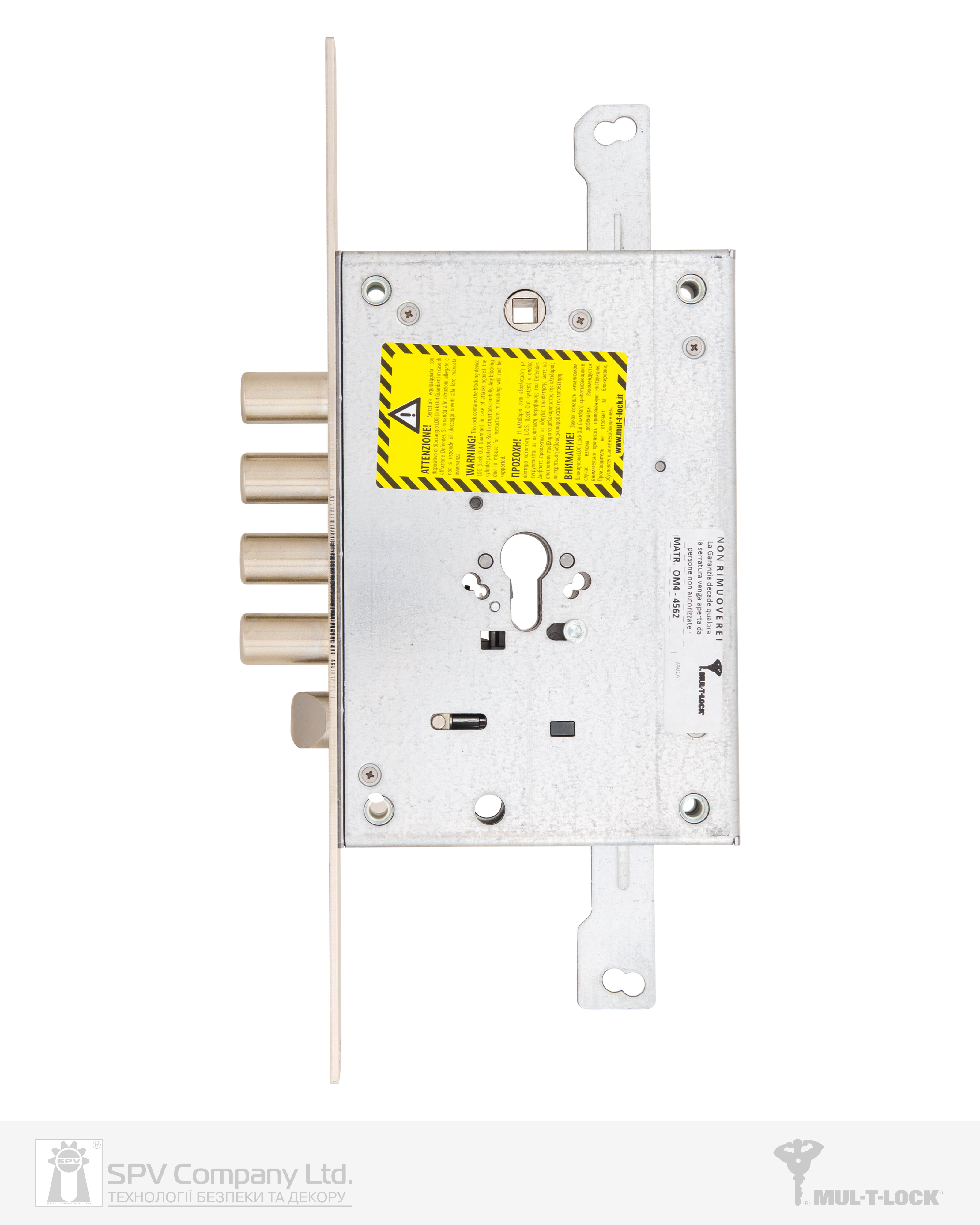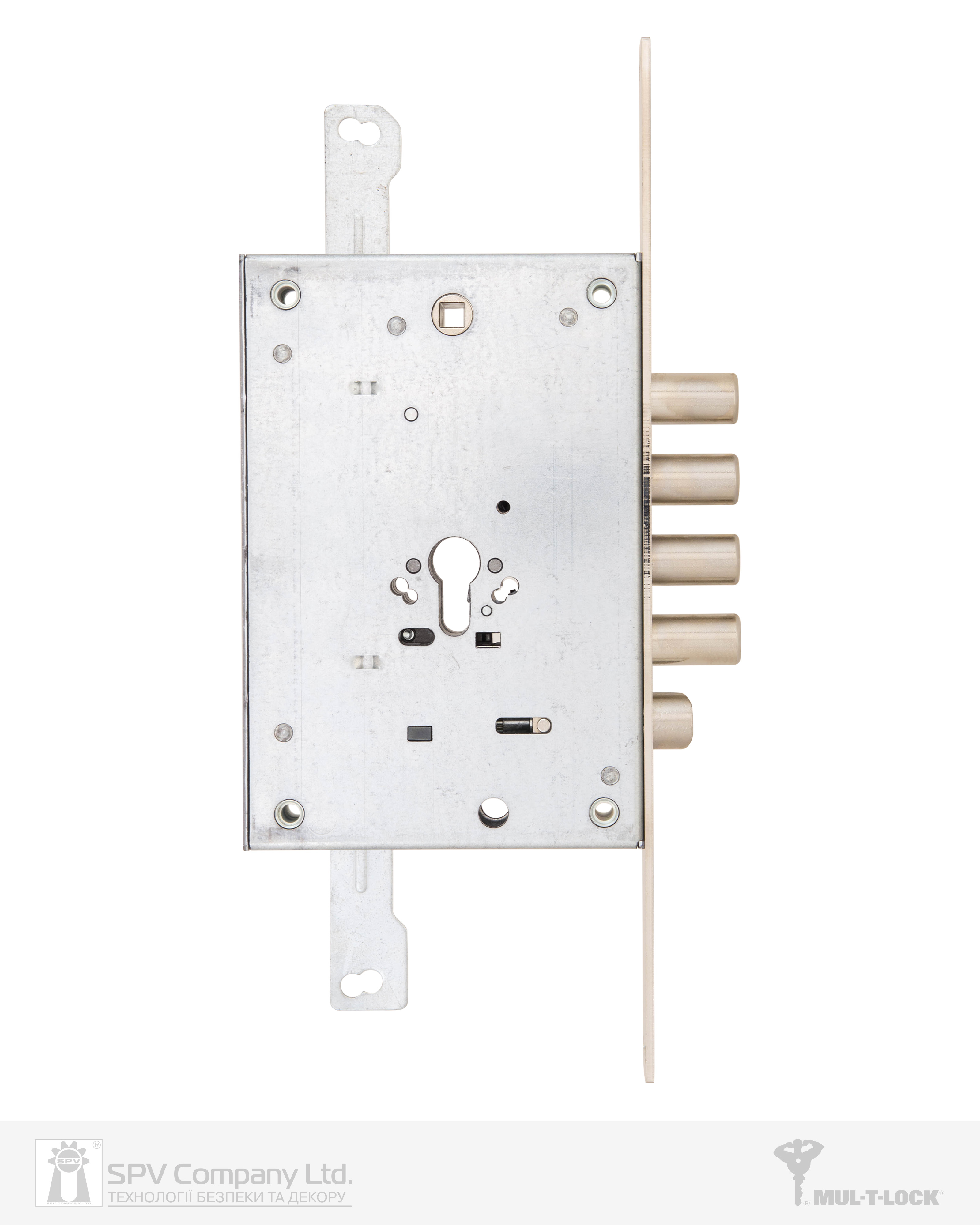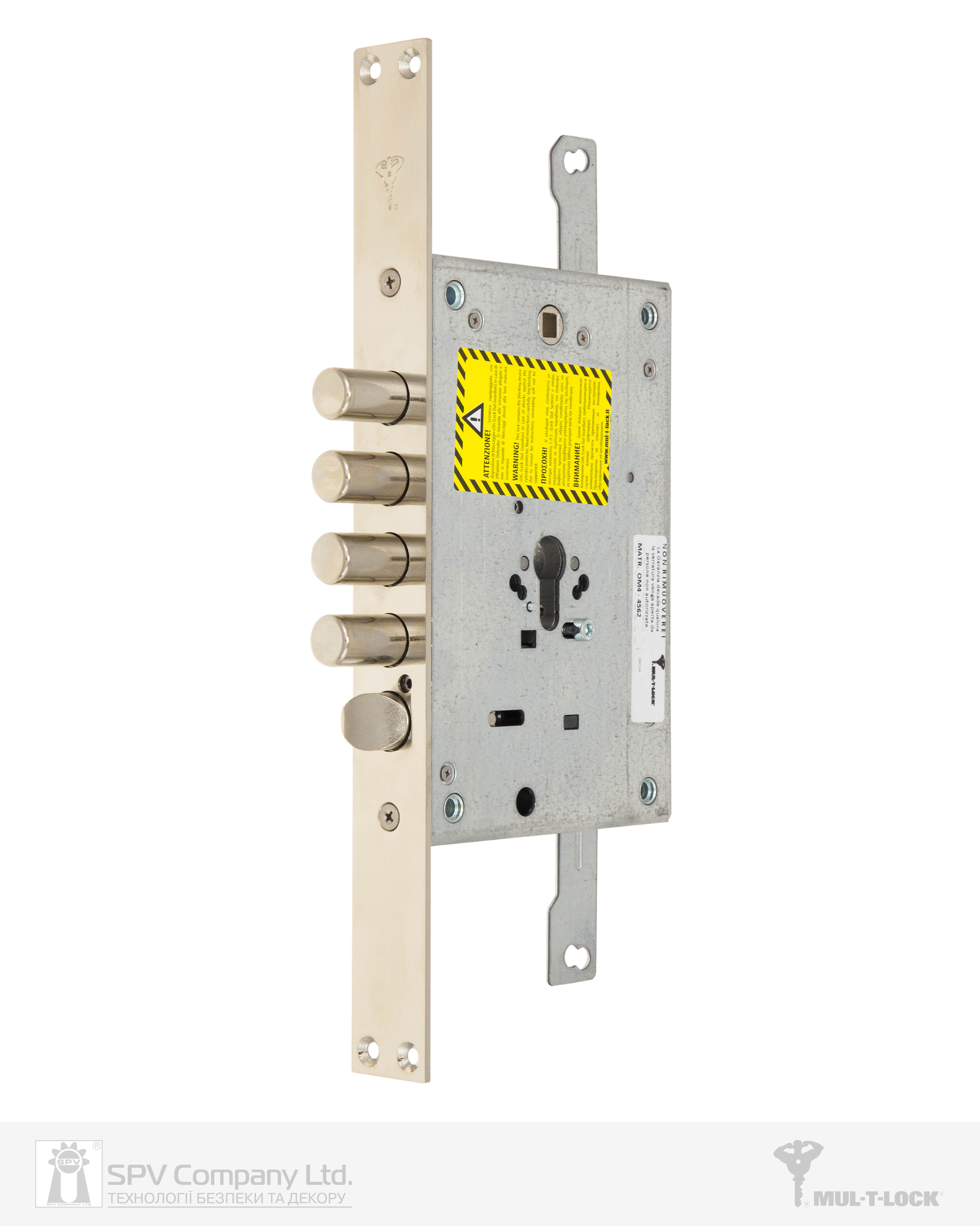 Основний замок 3-направленого замикання MUL-T-LOCK-ESETY CTM1 під циліндр EuroDIN. Mіжцентрова відстань 85 мм. BackSet 65 мм. 4 сталеві ригелі Ø 18 мм, вихід 30мм. Реверсивна заскочка з нержавіючої сталі. Вихід вертикальних тяг 20 мм. Зворотна планка, тяги не постачаються.