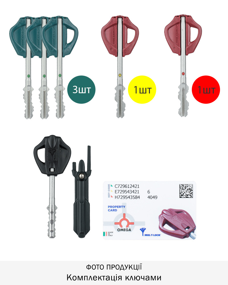 Комплектація: замок, ключі 1+3+1+1 ключів (1 монтажний ключ, 3 ключі з зеленими мітками для щоденного використання та кодова картка, 4-й ключ з жовтою та 5-й ключ з червоною мітками і кодова картка для перекодування (Система «VIP» + «Світлофор»)).