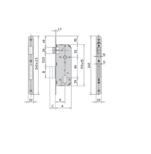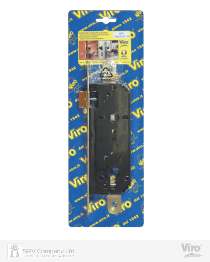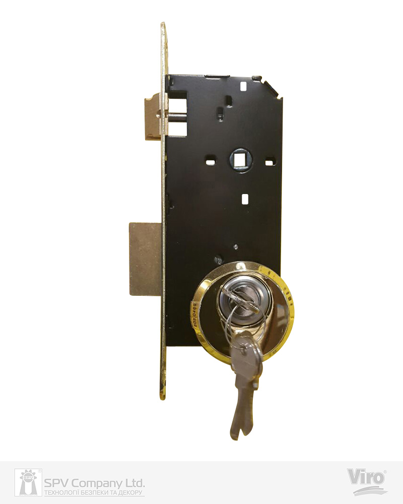 Врізний замок Viro сумісний циліндрами DIN профілю. Корпус: повністю закритий, з пофарбованої сталі. Стандартні наскрізні отвори DIN - для установки броненакладок. Міжосьова відстань (відстань від ручки до ключового отвору) - 85 мм. Отвір для ручки 8 мм. Ширина корпуса 76мм. Вихід ригела 20мм при двох обертах ключа. Колір торцевої та зворотної планок - латунь
