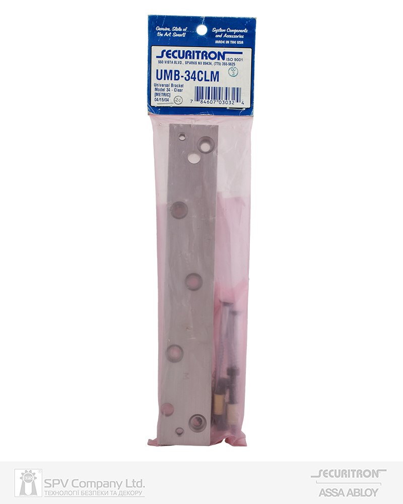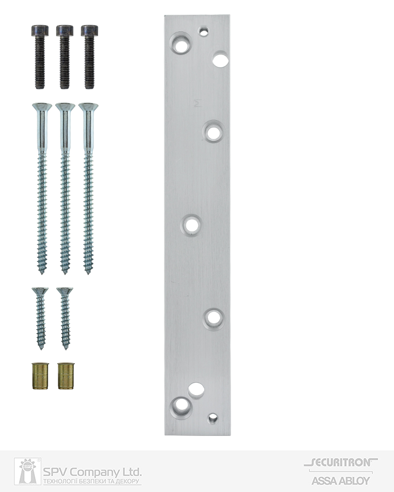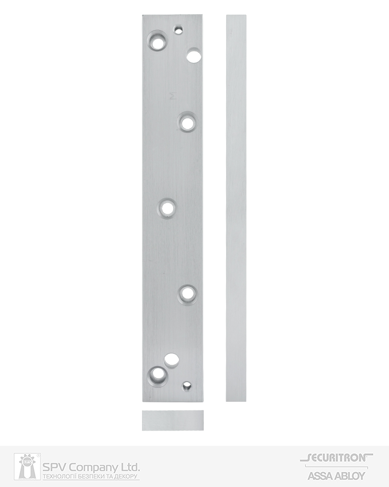 Монтажна пластина до замка Securitron M34 для монтажу на алюмінієві, залізобетонні або дерев'яні дверні рами. Використовується коли необхідно опустити замок нижче. Має преднарізані отвори для кріплення замка