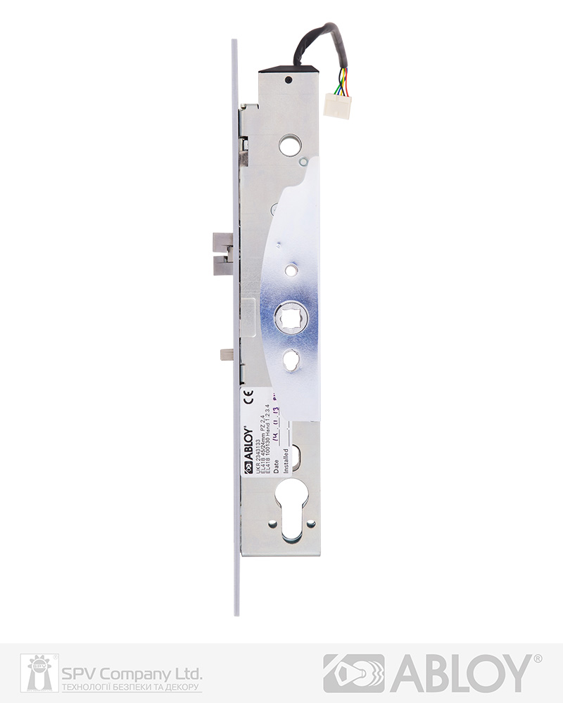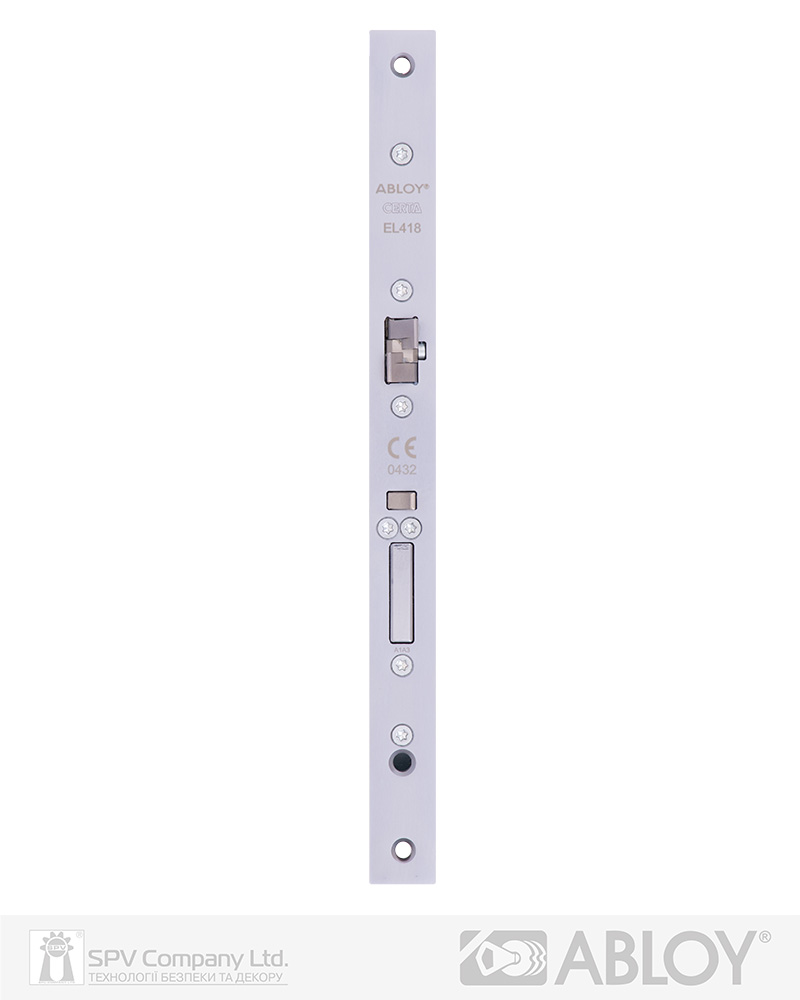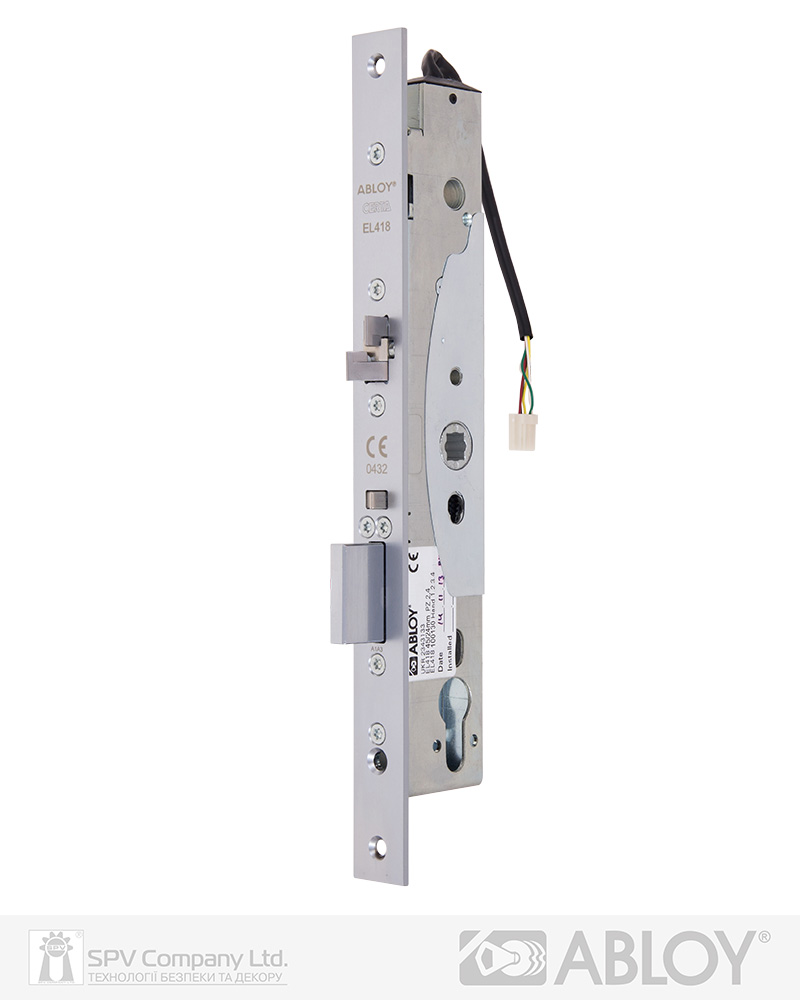- основний корпус моторного замка ABLOY® EL418 серії CERTA двохригельний: основний прямий ригель та додатковий ригель подвійної дії – коли на замок подано робочу напругу шляхом електричного сигналу керування основний ригель самостійно втягується електромеханічним приводом (мотором) у середину корпусу замка, а додатковий ригель стає вільним на відмикання;