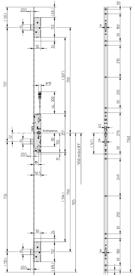 - передня (торцева) планка корпусу замка: 1760х24х6мм, прямокутна, симетрична, ширина 24мм, товщина 6мм, хромована сталь;