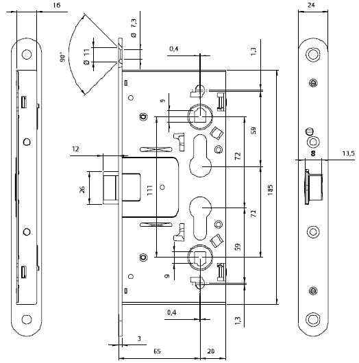 - керування: DIN-циліндрами з будь-якої із сторін дверей, DIN-циліндр не входить до комлекту замка;