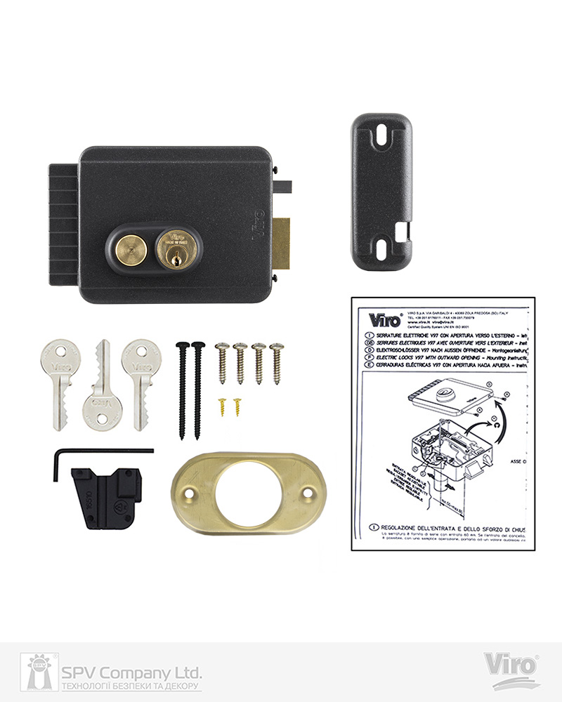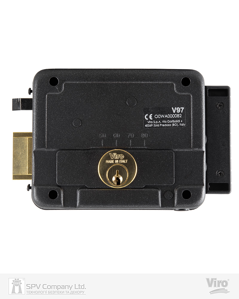 Електромеханічний накладний замок VIRO V97 моделі 8972.0794.1 керується електричним імпульсом змінного струму, з внутрішньою кнопкою виходу призначений для внутрішніх та зовнішніх дверей, вуличних брам, хвірток, захисних розпашних решіток, відкривання яких здійснюється до середини приміщення чи на сторону внутрішньої території об’єкту, як основний замок для розмежування контролю доступу.