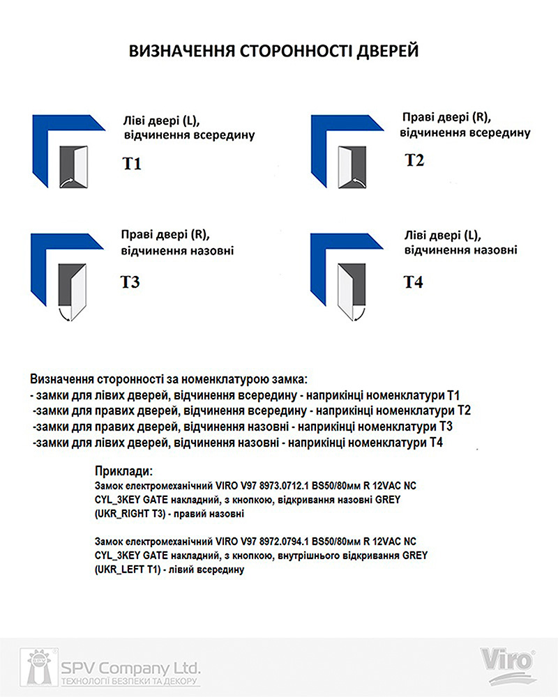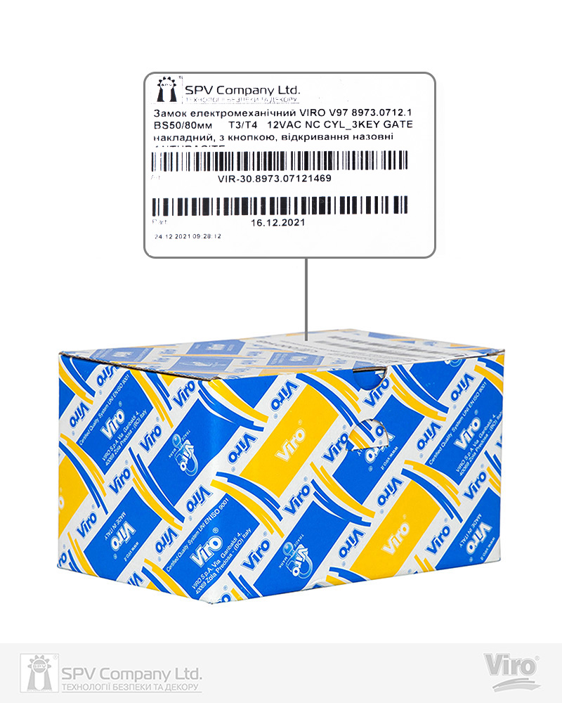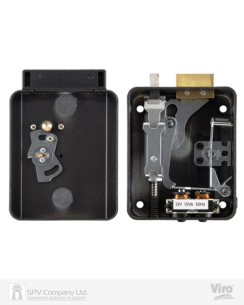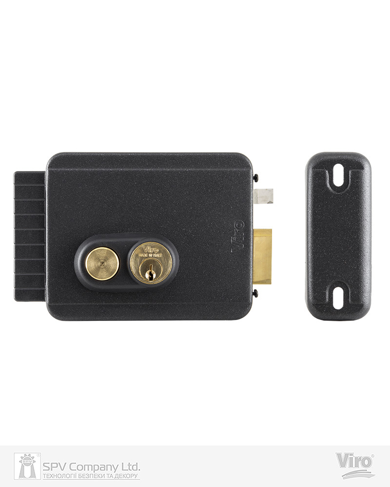 Електромеханічний накладний замок гаражного типу VIRO V97 моделі 8973.0712.1 керується електричним імпульсом змінного струму, з внутрішньою кнопкою виходу призначений для внутрішніх та зовнішніх дверей, вуличних брам, хвірток, захисних розпашних решіток, відкривання яких здійснюється назовні приміщення чи з території об’єкту, як основний замок для розмежування контролю доступу.