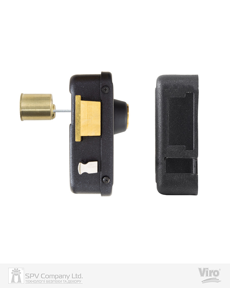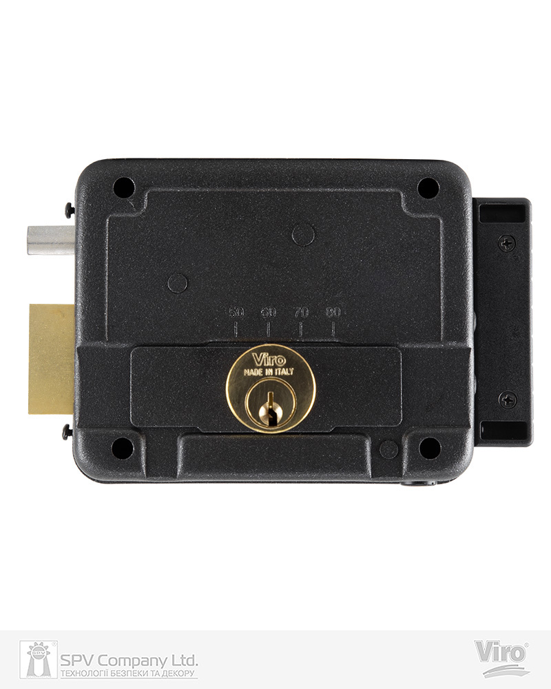 - замок взаємозамінний за BackSet та отворами кріплення із більшістю накладних замків VIRO: при монтажі можна використовувати з раніше встановленою запірною планкою іншого замка.