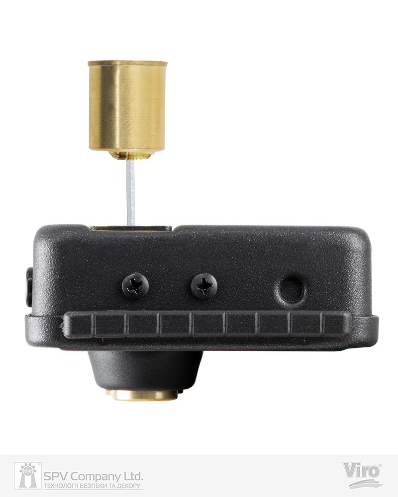 - комплект пари циліндрів VIRO 791/712: круглі, п’ятипінові, з твердої латуні; внутрішній VIRO 791 зафіксований до корпусу замка, не регулюсється; зовнішній VIRO 712 із хвостовиком зчеплення до механізму замка, довжина хвостовика регулюється в межах 35-85мм; клас захисту Standard Security – плуги і піни латунні, захист від свердління - піни грибовидної форми; маса комплекту 0,27кг; ключі універсального спецпрофілю VIRO UN;