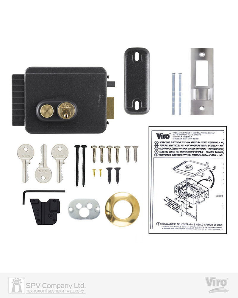- корпус замка VIRO V97 моделі V8973.0712.1, комплект запірних планок V8973.217, комплект пари циліндрів VIRO 791/712 спецпрофіля VIRO UN, фіксована ручка, внутрішня кнопка виходу, супортна овальна накладка на циліндр з кнопкою, зовнішня декоративна накладка на циліндр, електричні елементи замка, шестигранний ключ для регулювання виходу основного косого ригеля, монтажний комплект з елементами кріплення, паспорт-інструкція користувача, пакувальна упаковка.