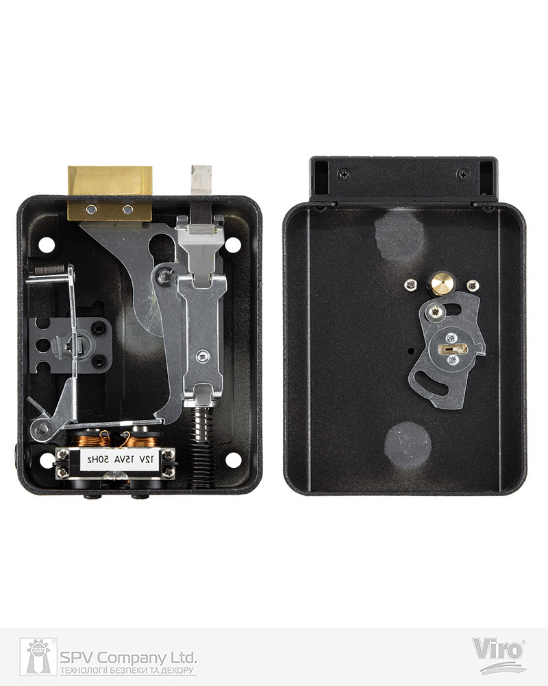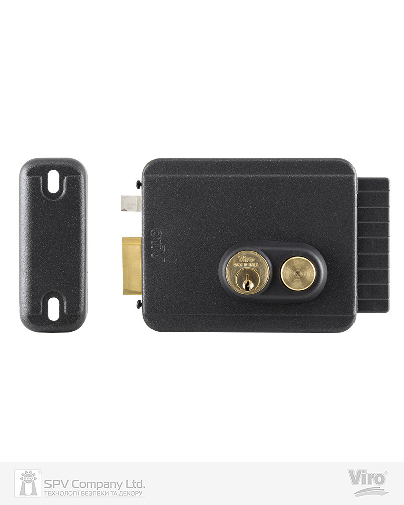 Електромеханічний накладний замок гаражного типу VIRO V97 моделі 8973.0712.2 керується електричним імпульсом змінного струму, з внутрішньою кнопкою виходу призначений для внутрішніх та зовнішніх дверей, вуличних брам, хвірток, захисних розпашних решіток, відкривання яких здійснюється назовні приміщення чи з території об’єкту, як основний замок для розмежування контролю доступу.