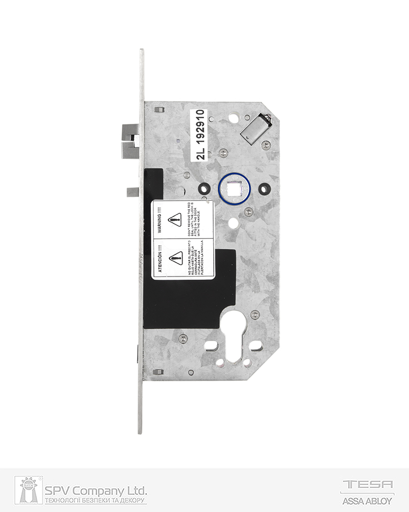 - Врізний замок: електромеханічний замок TESA ADB з автоматичним замиканням на основний ригель