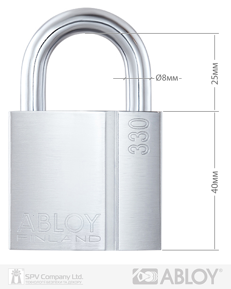 Матеріал: корпус-латунь, дужка- сталь із вмістом бору або нержавіюча сталь. Діаметр дужки - 8 мм. Висота дужки - 25 мм. Ширина дужки - 25 мм. Обробка: хром.