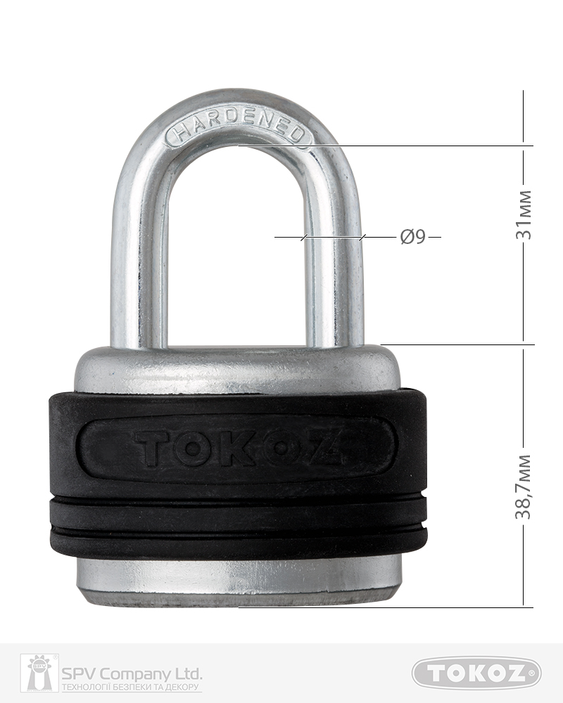 Закривається дужкою із загартованої сталі (діаметр дужки 9мм).