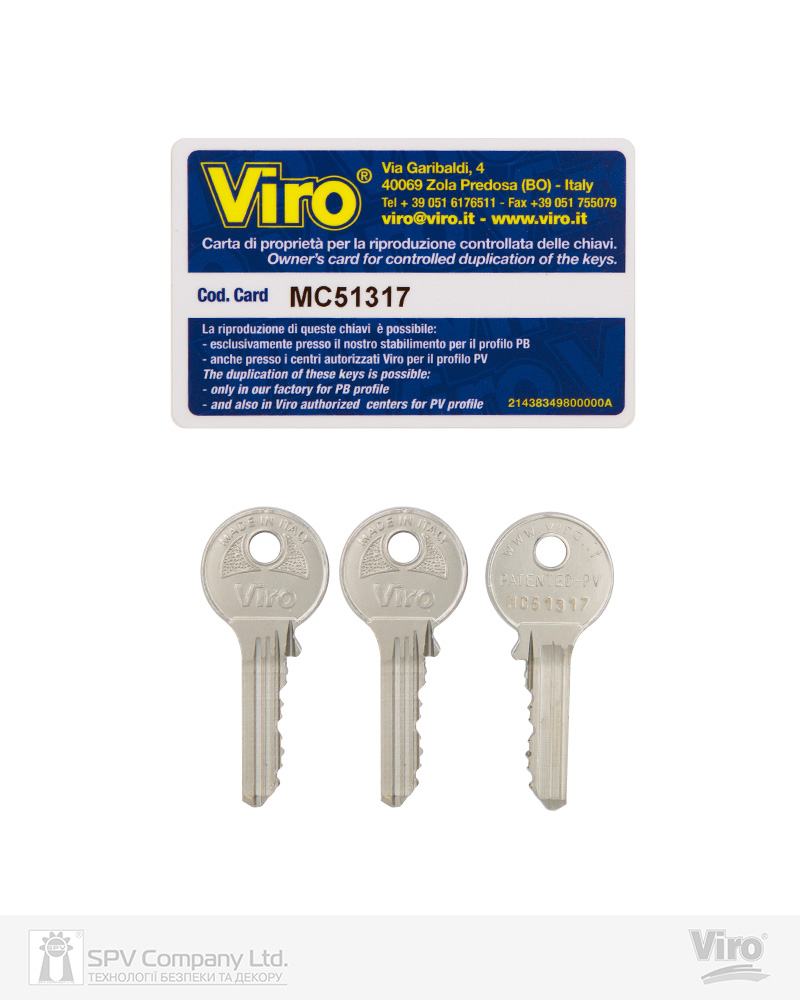 Ключі: 3шт., з нікельованої латуні, профіль Viro Top Security (патентований .PV профіль - виготовлення ключів в сервісному центрі VIRO ).