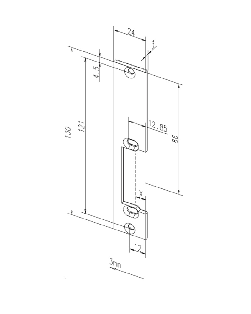 Коротка зворотна планка без отвору для основного ригеля замка та з функцією FIX (регулювання положення електромеханічної защіпки відносно планки). Призначена для встановлення електромеханічних защіпок у дерев’яні та металеві рами. Сумісна з усіма стандартними електромеханічними защіпками EFF EFF (серій Е7, 14).